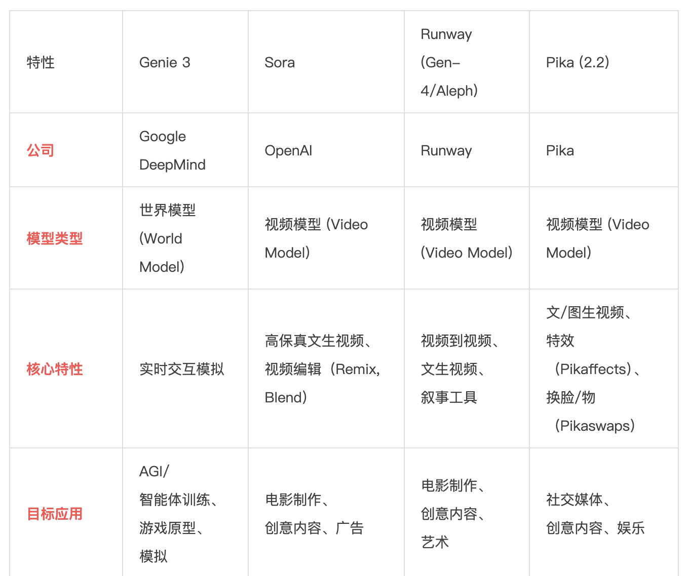 对于普通用户来说,Genie 3、Sora、Runway等模型似乎都在做“AI生成视频”这件事。但深入剖析其核心技术和设计理念,会发现它们分属不同的物种。