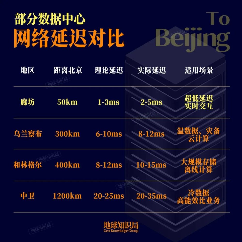 相比位于内蒙古和林格尔、乌兰察布、宁夏中卫的数据中心,廊坊的数据中心的网络时延更低。从廊坊到北京的时延只有2~3毫秒,要是从内蒙古过来就得5毫秒左右,而宁夏可能就要8毫秒了。