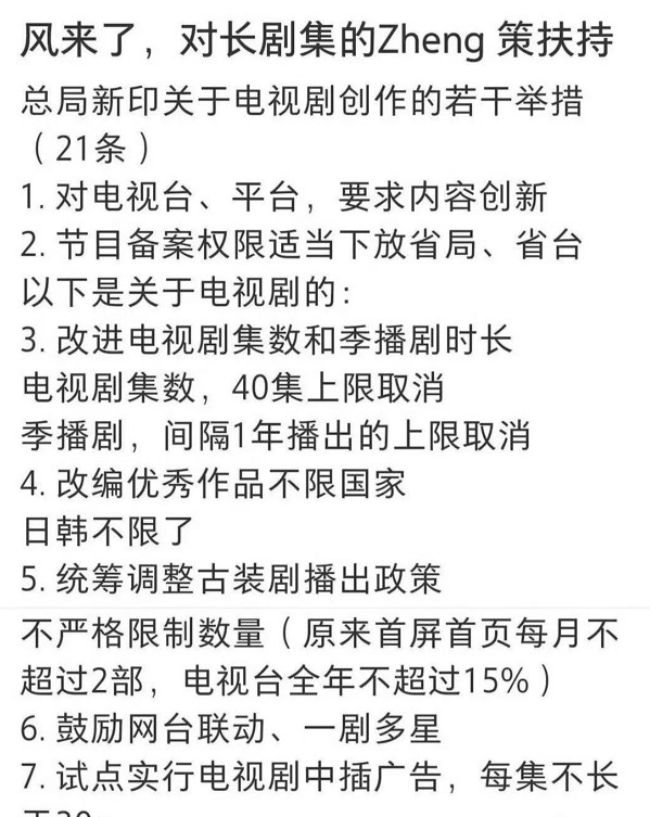 8月15日,广电21条的内容就在行业内流传开。其中,关于取消剧集40集上限、取消季播剧间隔一年播出限制、调整古装剧播出政策、鼓励网台联动与一剧多星、放开优秀作品改编的国别限制等内容引发极大关注。