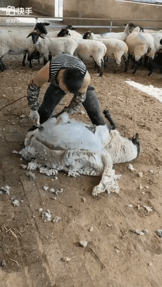 他用钩子轻轻放倒羊,不用绑住羊腿,手持电动剪毛机,从一条腿开始往下推,所经之处寸毛不留,非常丝滑。等到翻身时,他抓住羊头稍稍一带,四脚朝天的羊儿乖乖就范,任他脱去这厚厚的“棉袄”。