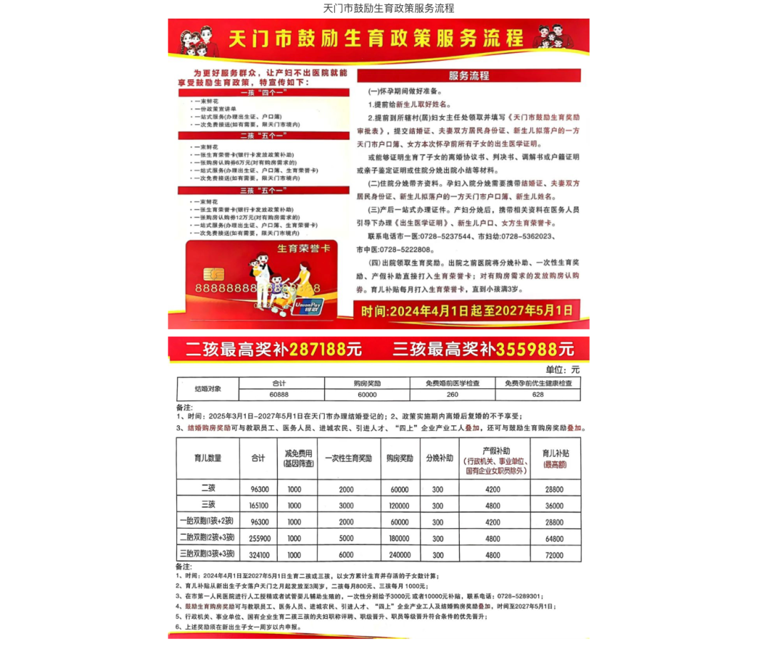 叠加这些补贴、奖励后,在天门生育二孩、三孩的家庭最高可分别享受21.6万元、28.5万元的综合补贴。