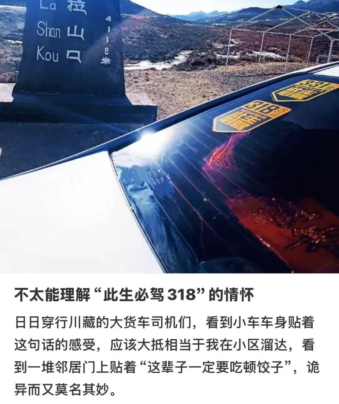 不管是开豪车的小老板,还是开比亚迪的滴滴老司机,或者仅仅是骑电动车的外卖小哥,车屁股上都会郑重地贴着一张“此生必驾318”的贴纸。