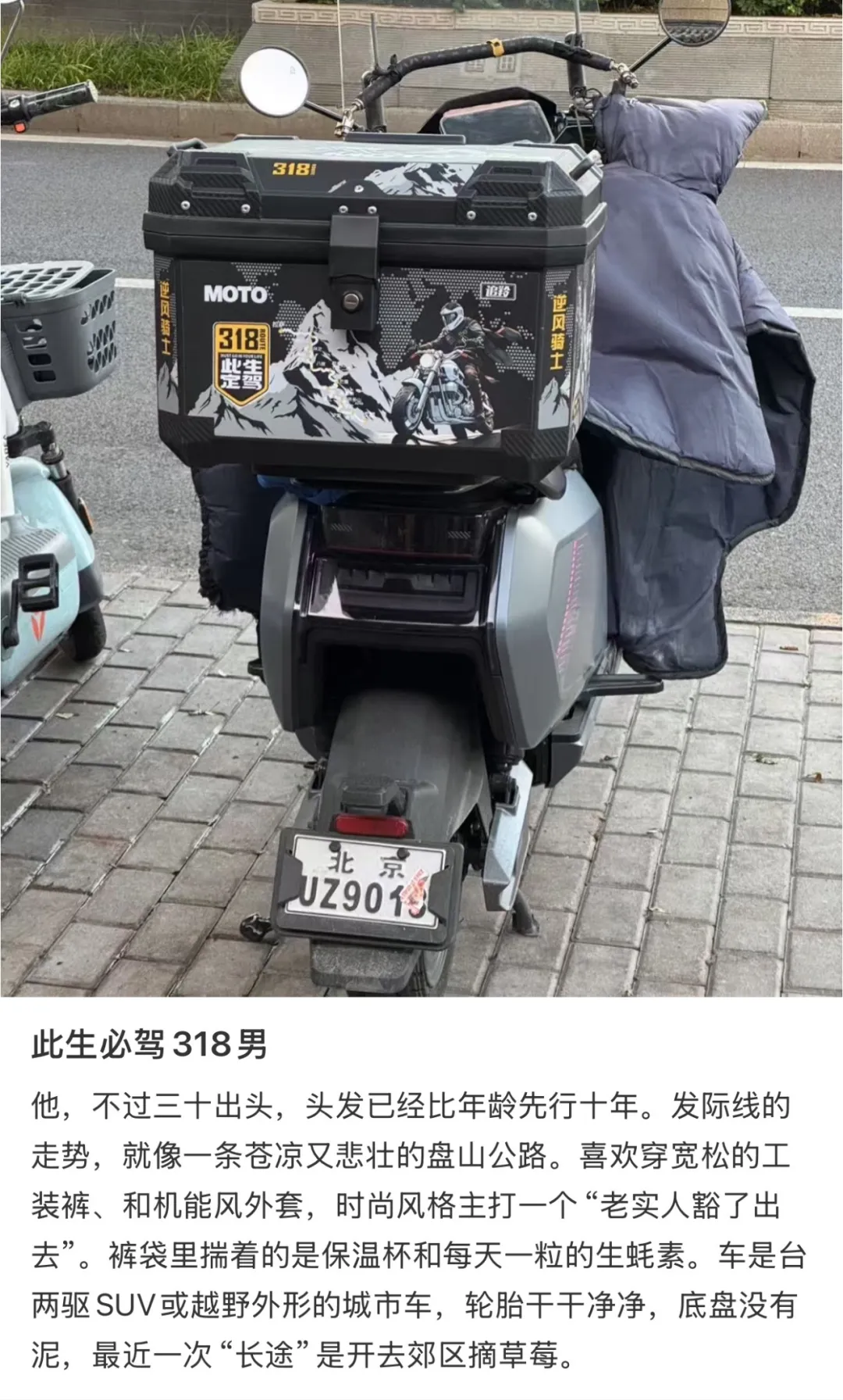 而“此生必驾318”则是中男审美的一种外显。如果你自认为还不是中年人,却也加入了这场贴纸跟风,或许只是因为你还没意识到,自己已经一脚踏进了中男行列。