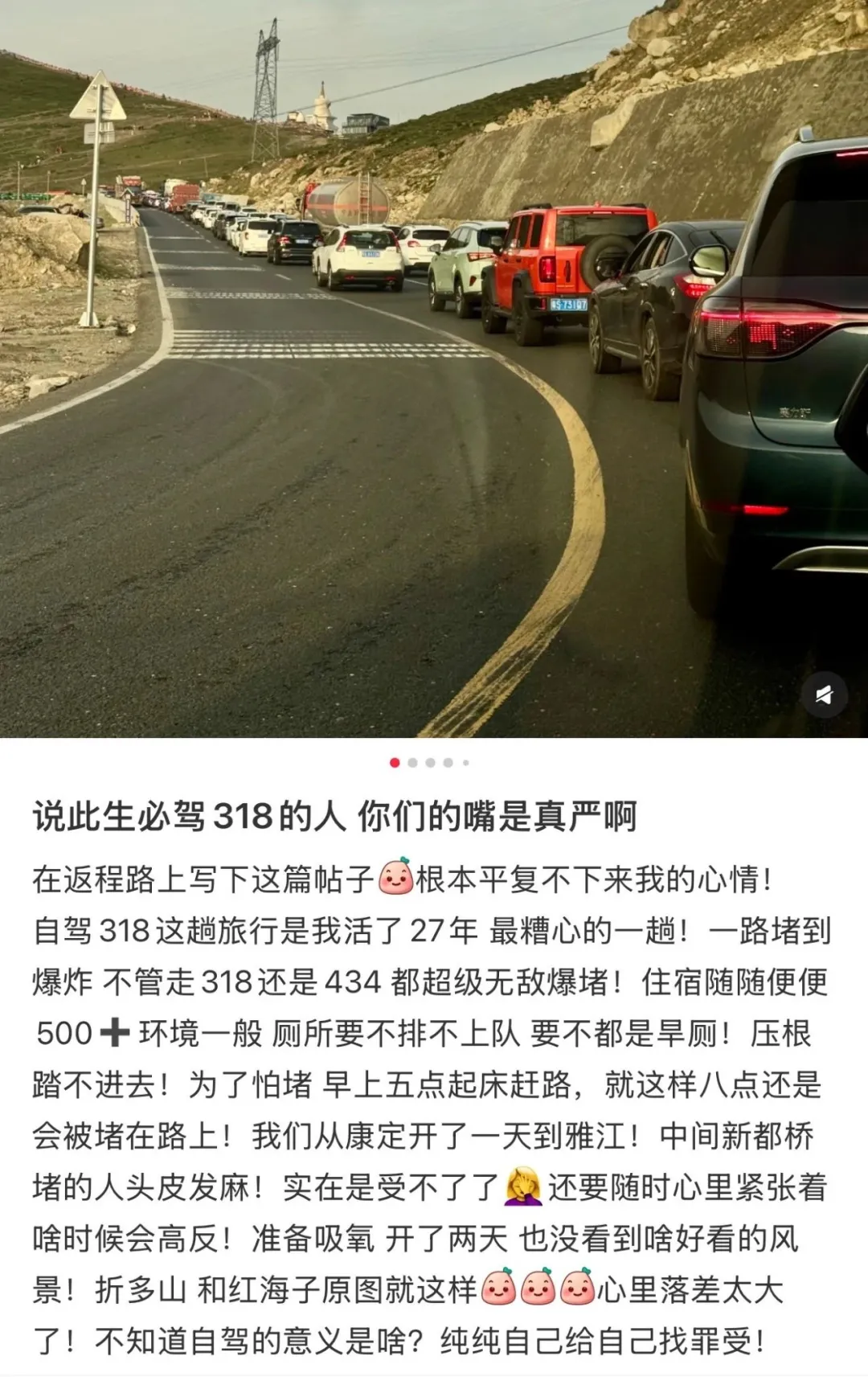 而成都到康定段,因为“此生必驾318”的网红打卡效应,早已变成“全国各地车牌展览会”,天天上演着堵车大戏。