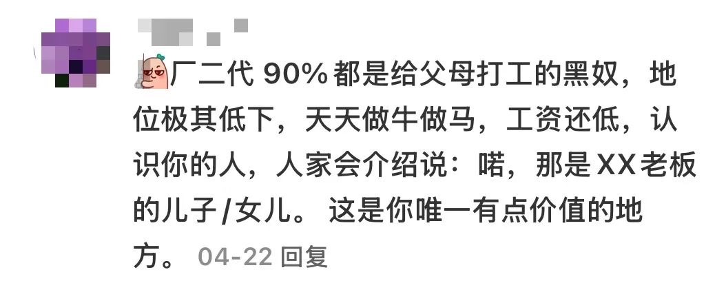 “更重要的是,厂二代不太会享受生活。一些回家接班的厂二代,过得比打工人还惨。一个月三千块,生产队的驴也不敢这么使,只想说真的没空跟我爹闹了。”