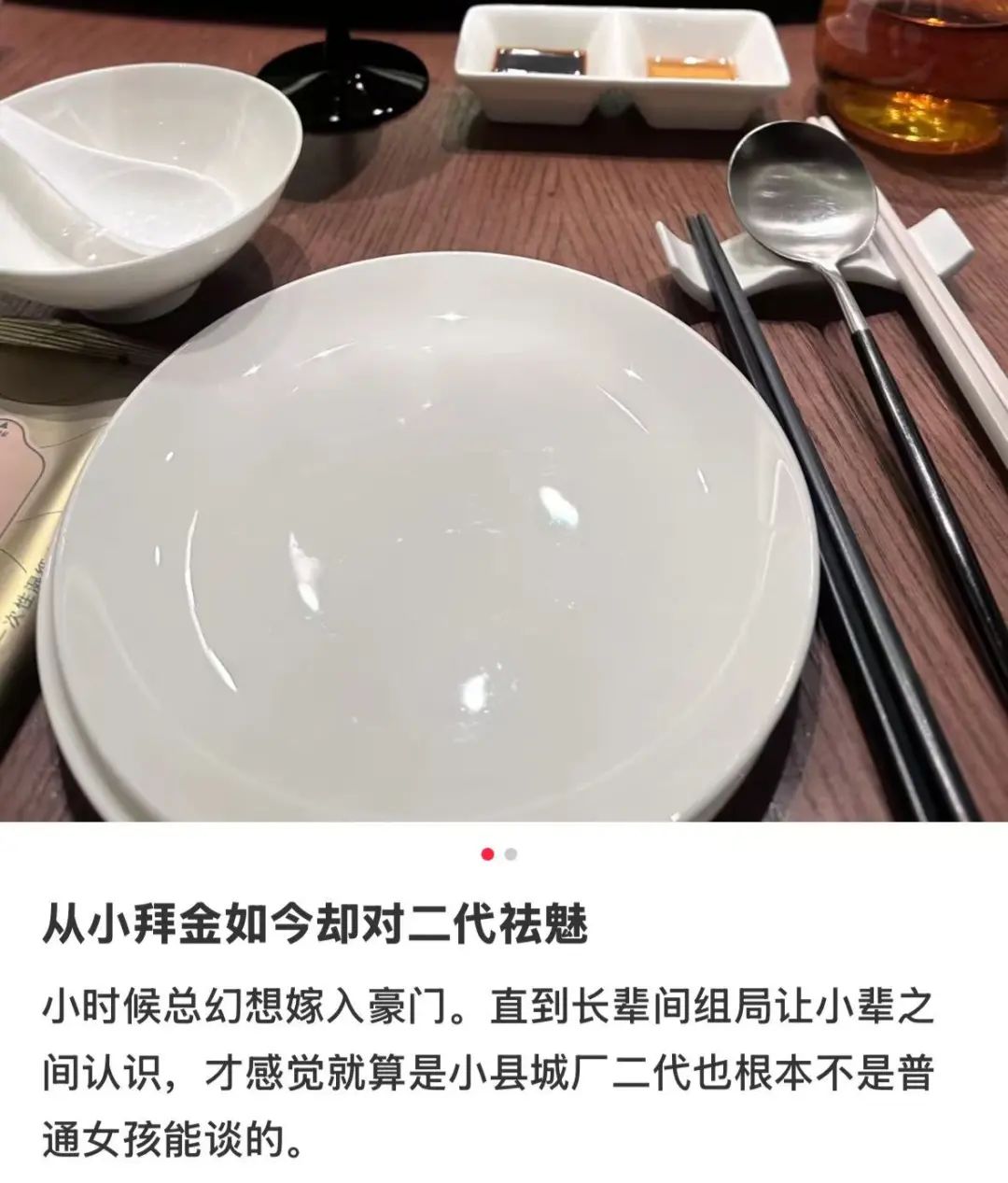 “此外,厂二代这种老式男友,平时根本不太爱上网。所以他们不知道最近流行什么牌子货,也不会带你去吃bistro和漂亮饭。他们吃穿用度都是从自己家厂子里拿的,带你去吃的饭也是便宜好吃的苍蝇馆子。”