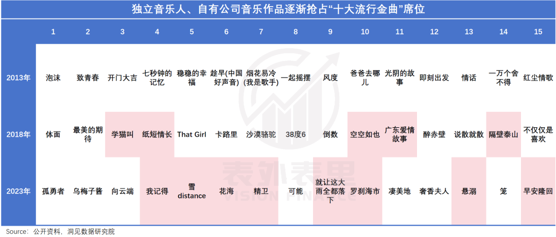 可以看到,2013-2023年十大流行歌曲榜单中,大唱片公司上榜歌曲递减,来自独立音乐人、自有公司的作品逐渐占据半壁江山。