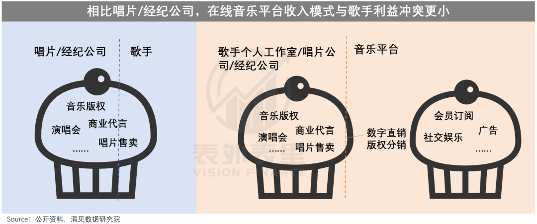 以往唱片公司、经纪公司为回收“造星”成本,会从歌手音乐版税、商业代言等收入中大笔抽成,而音乐平台有会员、广告、社交娱乐收入,能腾挪出更大让利空间。