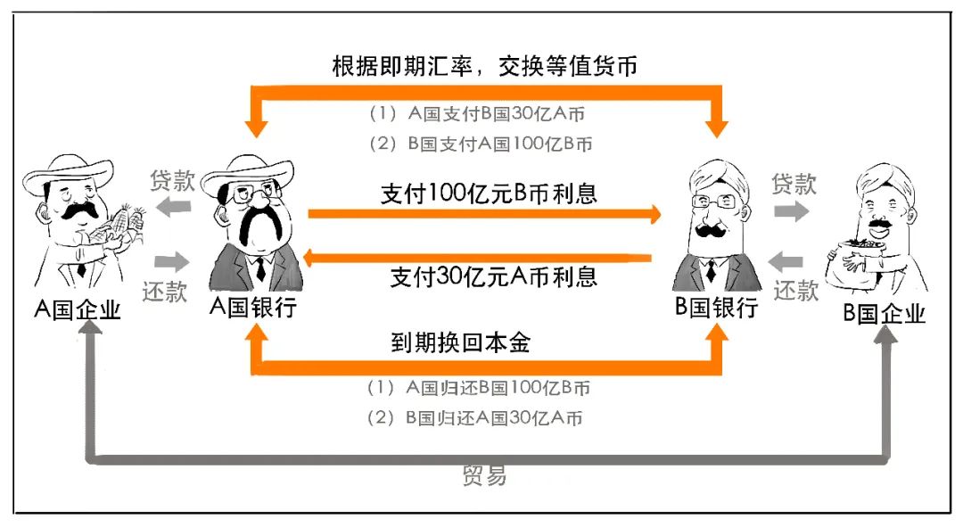 等期限到了,两家银行再将各自货币换回来,收回的本金与先前交换的一致,这样就规避了汇率波动风险,降低汇兑成本。