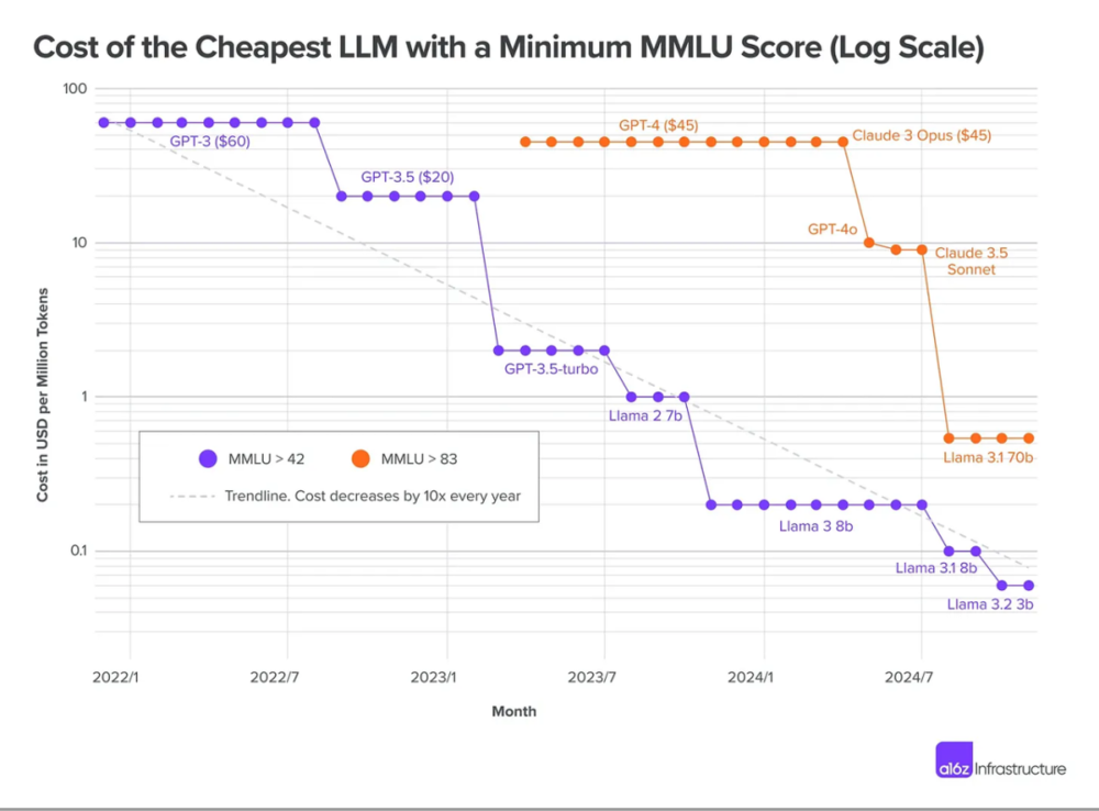 连 a16z 都在说,大语言模型(LLM)成本正以每年 10 倍的速度下降。
