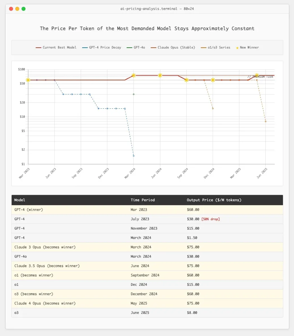 Substack 专栏《mandates》的这篇文章,则认为模型成本其实并没有在下降。“成本下降 10 倍是真实存在的,但仅限于那些性能老旧的模型。”