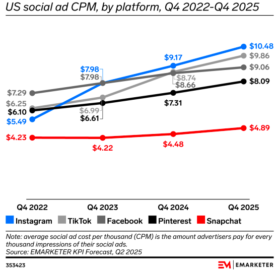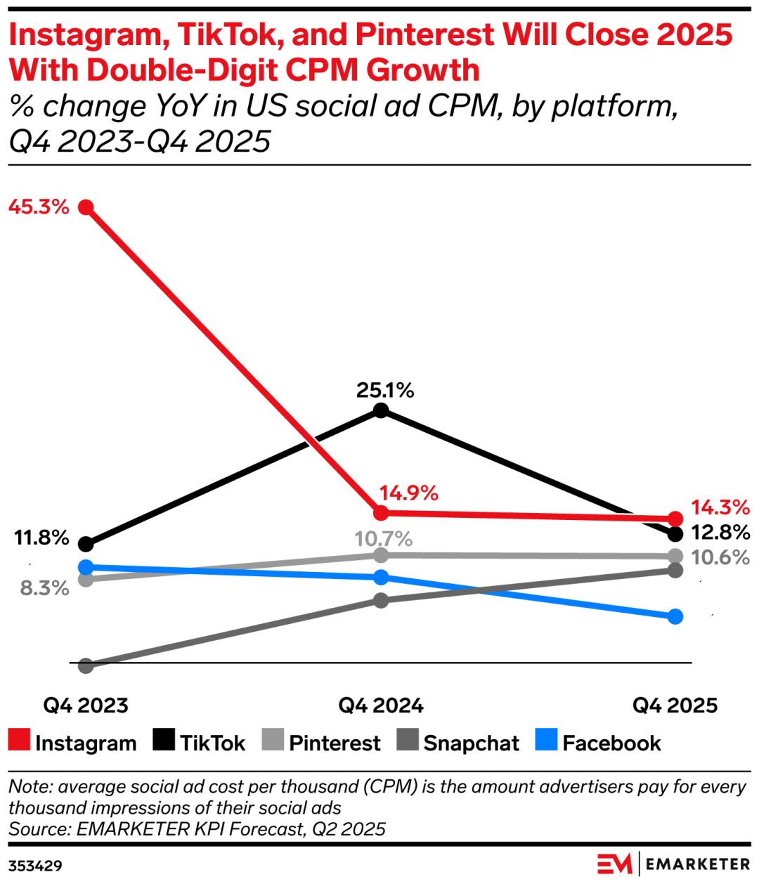 随着各大平台加速推广AI自动化投放工具,CPM(每千次展示费用)也水涨船高。eMarketer预计,到2025年第四季度,Instagram、TikTok和Pinterest在美国市场的CPM将实现两位数的同比增长;Snapchat和Facebook虽然涨幅略缓,但也在持续上行。