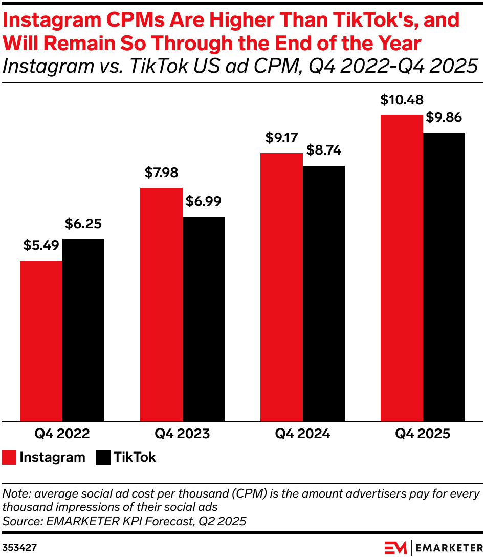 数据显示,TikTok的CPM(每千次展示费用)仍维持在两位数同比增长的轨道上。虽然相比过去几年的高速扩张,这种增速略有放缓,但这更多是“平台进入成熟期”的自然现象,而不是市场撤资的征兆。即便今年早些时候禁令短暂生效,导致TikTok的CPM出现轻微回调,但很快便恢复上涨趋势,预计在年底前将达到9.86美元,接近Instagram的水平。
