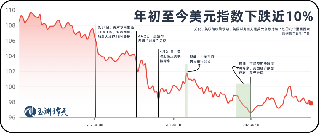 从今年的几个节点来看,美国政府的关税政策加速了这场下行。4月3日,在美国政府宣布对全球加征所谓“对等”关税后,美元指数下跌1.6%,创下2022年来单日最大跌幅。