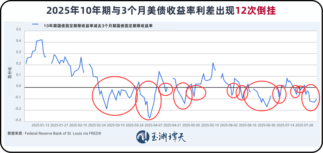 但今年的情况有些不同,按10年期与3个月国债利差,收益率曲线频繁倒挂。到现在,已经出现12次倒挂。