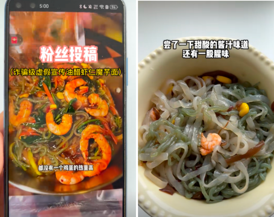 花50块钱买下3包打着“低脂高蛋白”的噱头。宣称“减脂期可吃”的免煮虾仁魔芋面,吃起来口感更接近纯粹的塑料。超长的配料表看不见蛋白质指数,只含丰富的山梨酸钾和焦亚硫酸钠。
