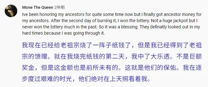 购买冥币的老外坚信,如果给祖先寄去这份“冥界快递”,就可以使自己转运,愿望成真,因此冥币又被外国网友叫做“Ancestor money”(祖先币)。