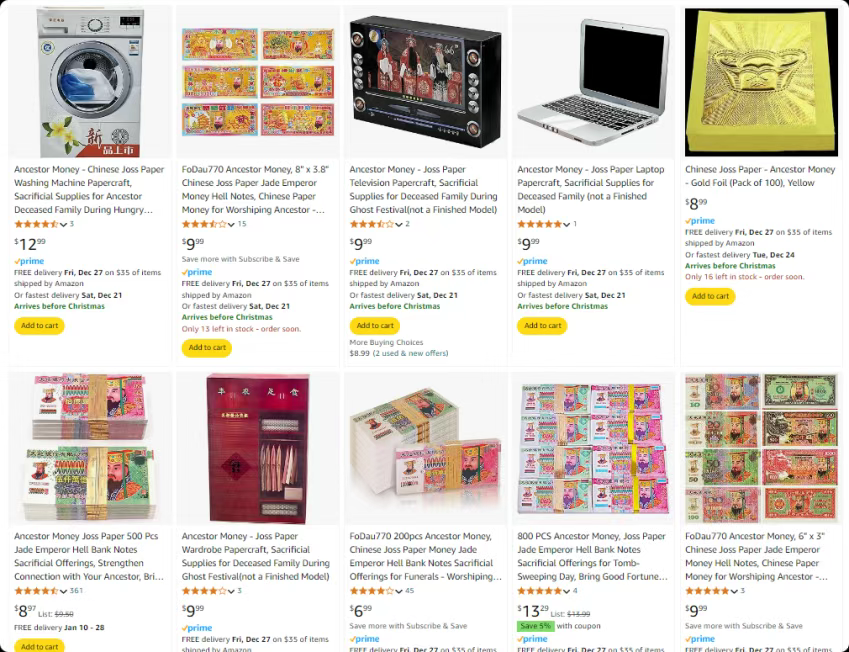 只要在亚马逊上搜索Ancestor money,就可以看到很多关于冥币商品,其中部分链接的评论达数百条。