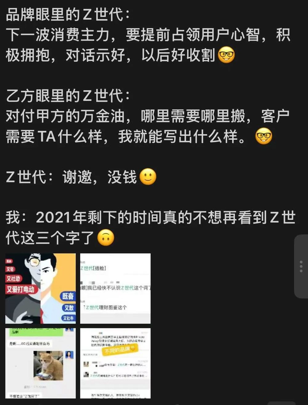 11、广告人的ptsd:对一些烂大街的词汇产生了强烈的厌恶感。比如有一段时间突然所有品牌都在讲Z世代。