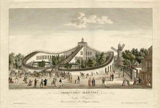 1817年,法国人又做了改进,轮子更结实,坡上装上了轨道。巴黎这座名叫“空中漫步”(法语名称“The Promenades-Aériennes”)的滑梯,被认为是史上第一座现代过山车。