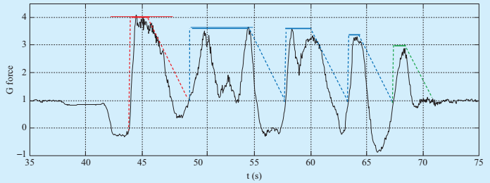 游客对G力的承受时间也有限制。G=6,持续时间不得超过1秒;G=5,持续时间不得超过2秒。G越小,允许持续的时间就越长。图3为某过山车的G力记录,最大G力为4,持续时间低于标准规定的6秒。