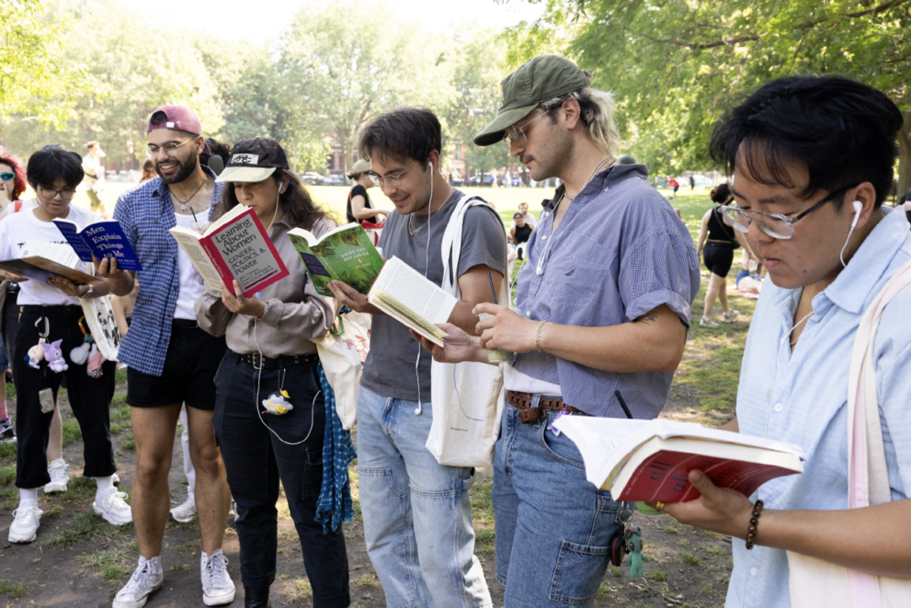 8月9日在芝加哥举行的performative male比赛。参赛者在排队报名比赛时,阅读《傲慢与偏见》等书籍。大赛获胜者获得了Homebody Matcha的优惠券|图源:Block Club Chicago