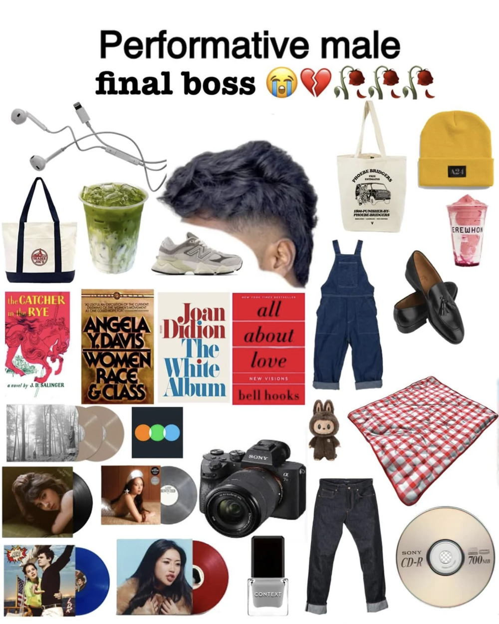 还是难懂?那就想象一下,在某间城市咖啡馆里,他坐在靠窗的位置,带着有线耳机听着Clairo,狼尾发型微微遮住眼角。他穿着略短的T恤和复古牛仔裤,脚边放着一只印有某展览纪念图案的帆布包,包上还挂着一个Labubu挂件。他一边喝着刚点的抹茶草莓拿铁,一边翻着《第二性》——你肯定遇到过这样的人。这一幕对无数文艺异性恋女性来说,就是一场钓鱼。