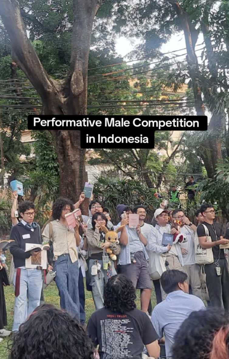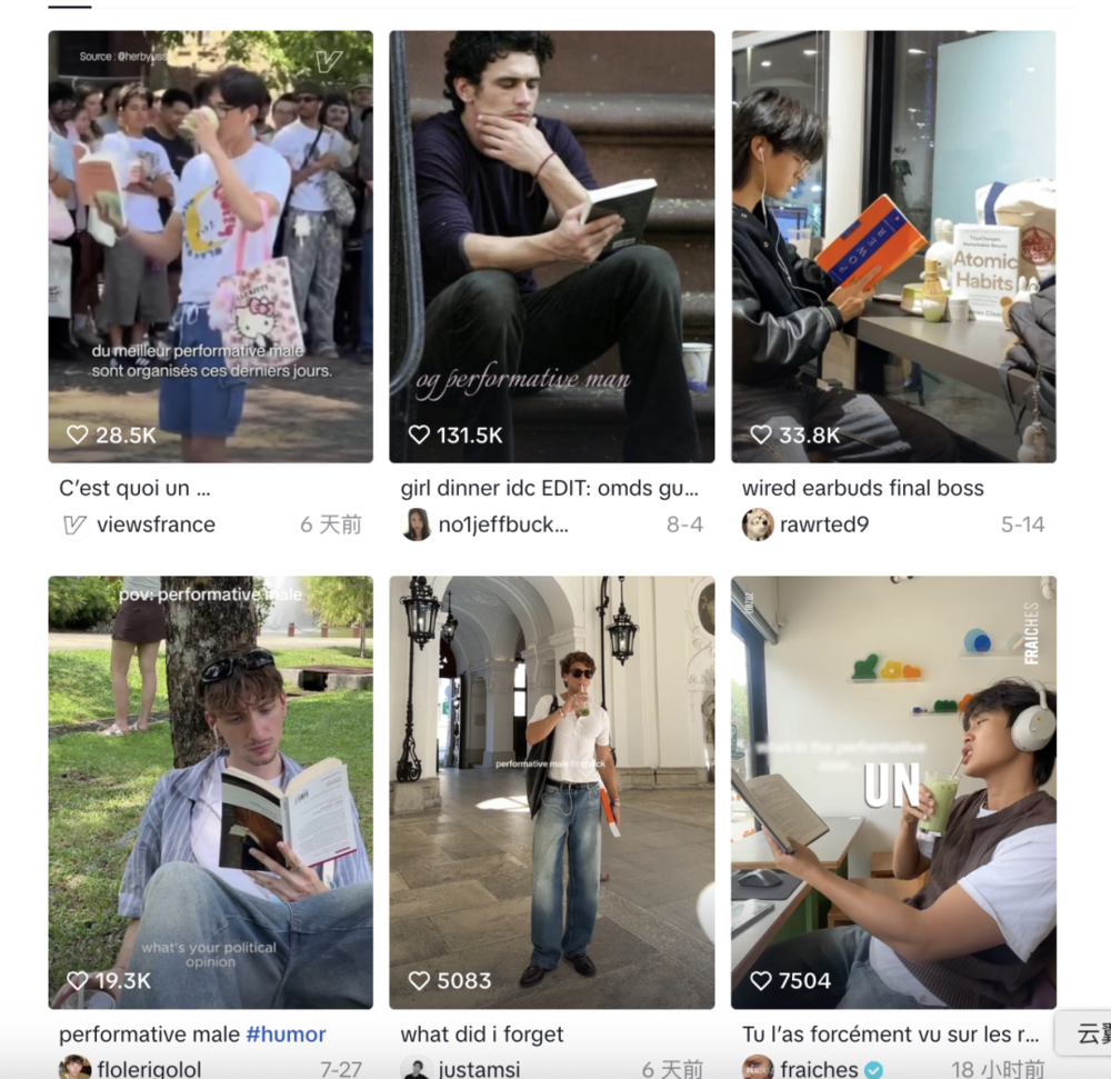 在TikTok上,人们给这类“把读书当作钓鱼饵”的男性起了个新名字——performative male(文艺表演男)。他们不只是装作爱读书,为了这个精致人设的成立,通常还会搭配一整套细节,不完全汇总如下: