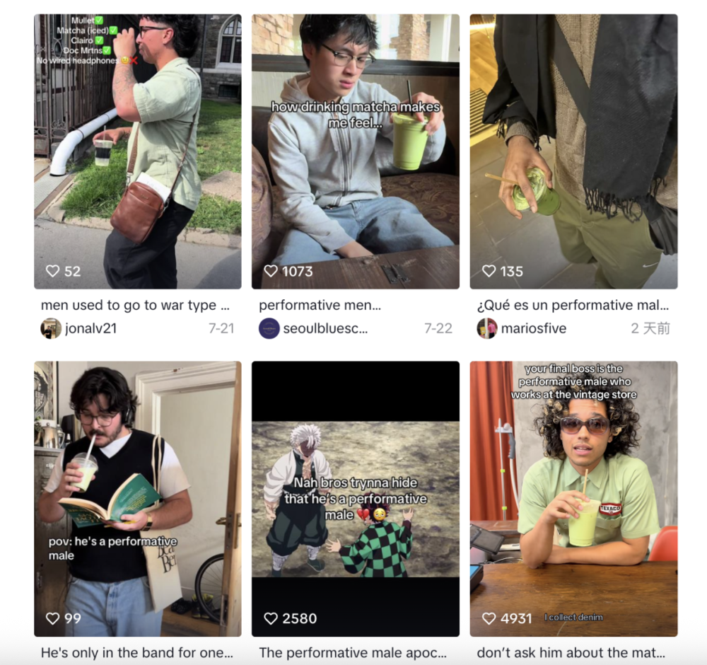 在TikTok上搜索“performative male”,出现的大多是对这种形象的嘲讽和戏仿视频。对performative male进行模仿、讽刺,仿佛自己不是这样的人、“我比他们更好”——但真的更好吗?