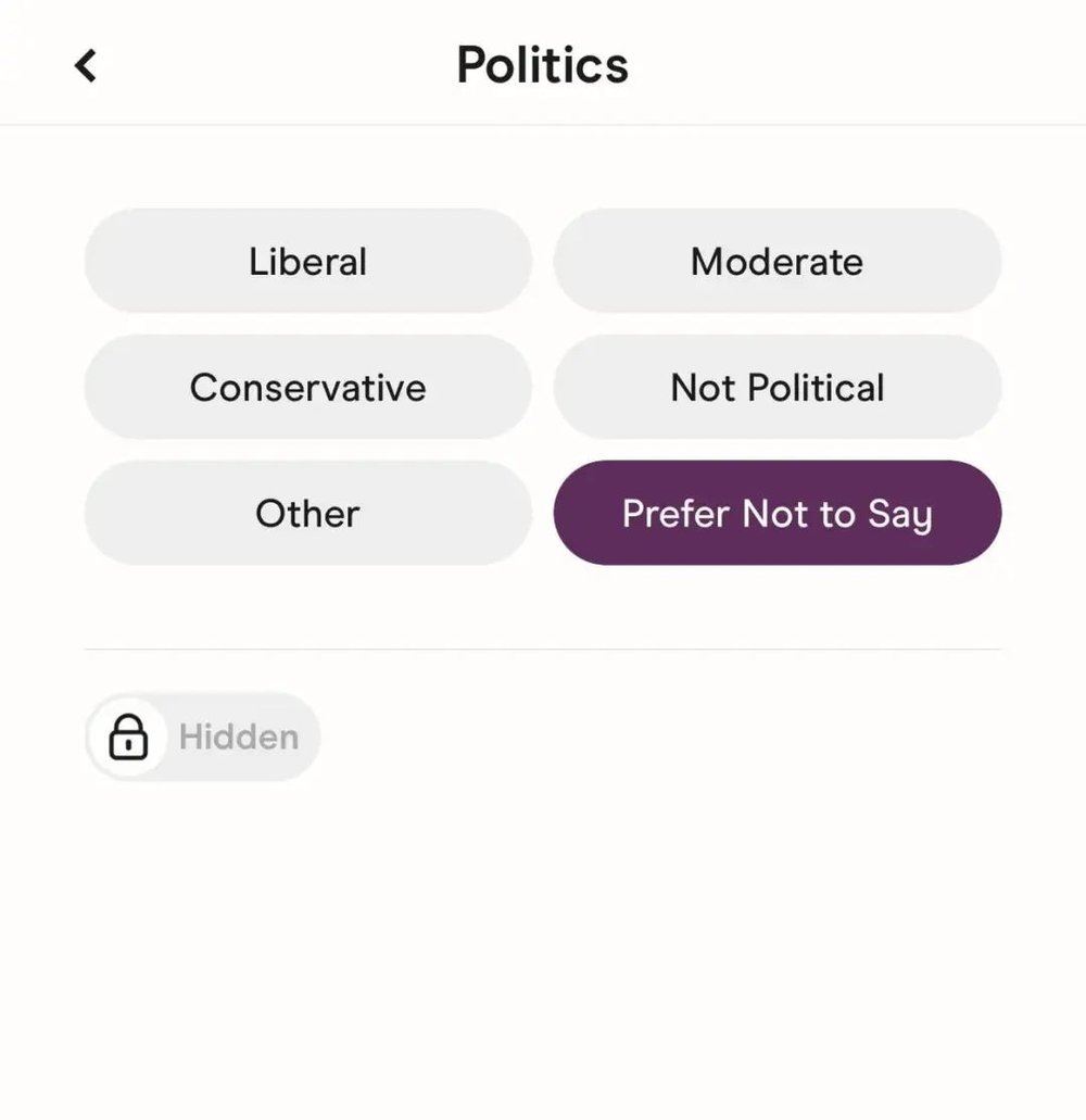 在英国和美国这两个Hinge目前的主要市场,大多数人的立场分为三种:保守派、中立与自由派。而意识形态倾向也有很长的一条光谱,对于很多在这三种之外的立场来说(尤其是自由派左边的立场),他们并不希望被贴上这样的标签。
