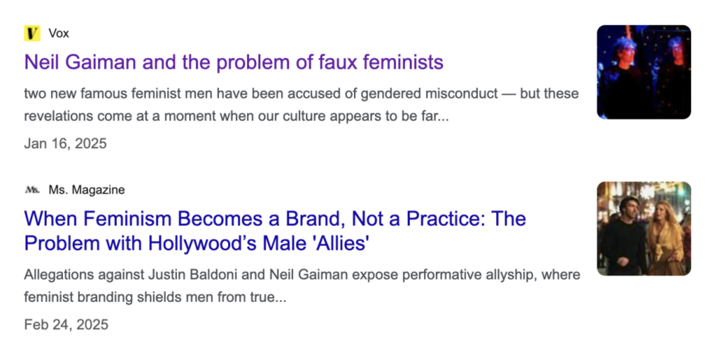英国作家Neil Gaiman,因其作品《睡魔》被Netflix改编而广为人知。他是公开的女性主义者,活跃于社交媒体,经常转发支持跨性别群体、鼓励受害者发声,甚至被妻子(已分居)称为“理想丈夫”。他似乎是进步男性的范本,是那个“完美异性恋男”。