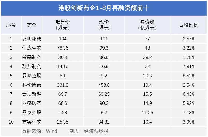 据经济观察报统计,开年以来,已有超20家港股创新药企再融资,远超去年同期,部分企业甚至进行了两次再融资。目前再融资额已超340亿港元。