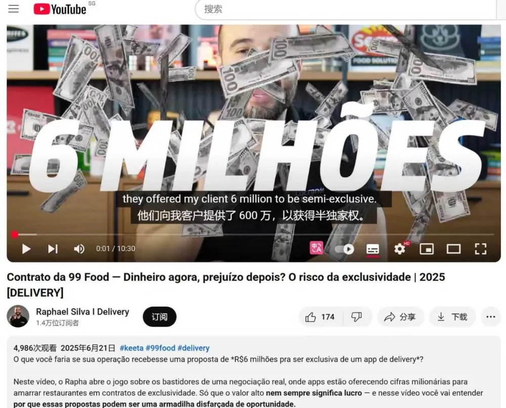 第一板斧是商户侧“二选一”排他性围剿。今年5月,美团宣布将Keeta引入巴西。很快,之前已经退出巴西外卖市场的99Food重回巴西。Keeta指控,99Food已砸下9亿雷亚尔(占其巴西总投资的90%,约12亿元人民币),向超100家餐饮连锁支付预付款,要求商户不得与尚未上线的Keeta合作,但允许与iFood合作。