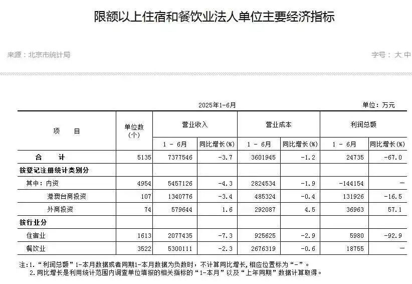 2025年上半年,北京市规模以上住宿和餐饮业利润下滑67%,较去年进一步收缩,737.8亿元的营收只赚到2.47亿元的利润,利润率仅有可怜的千分之三。