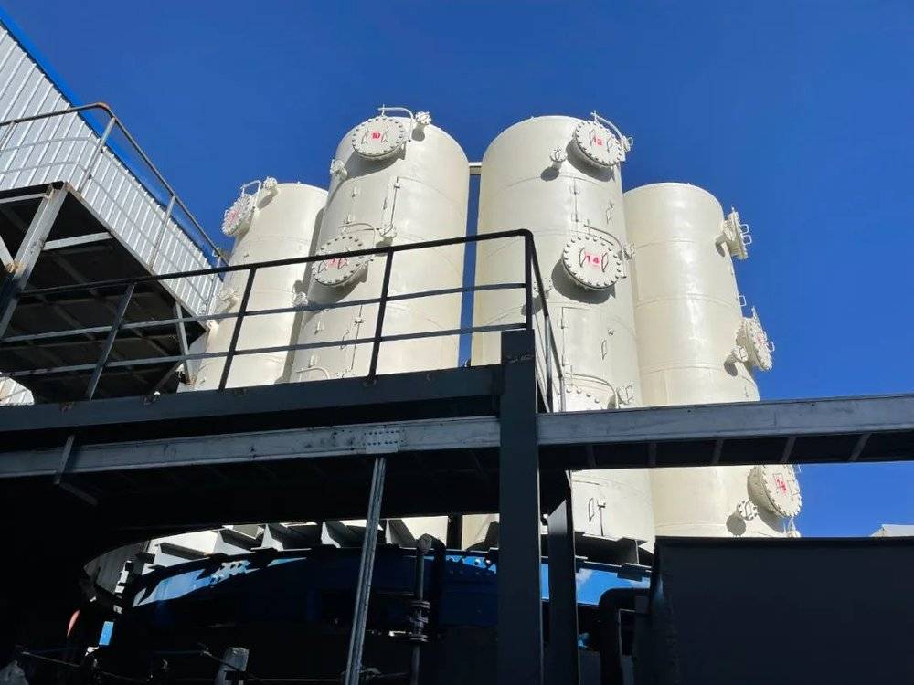 藏格控股的卤水分离车间外,一座座吸附塔耸立在门前,底下一个转盘在切换进入的卤水。