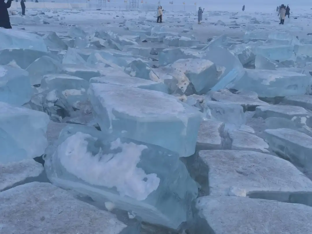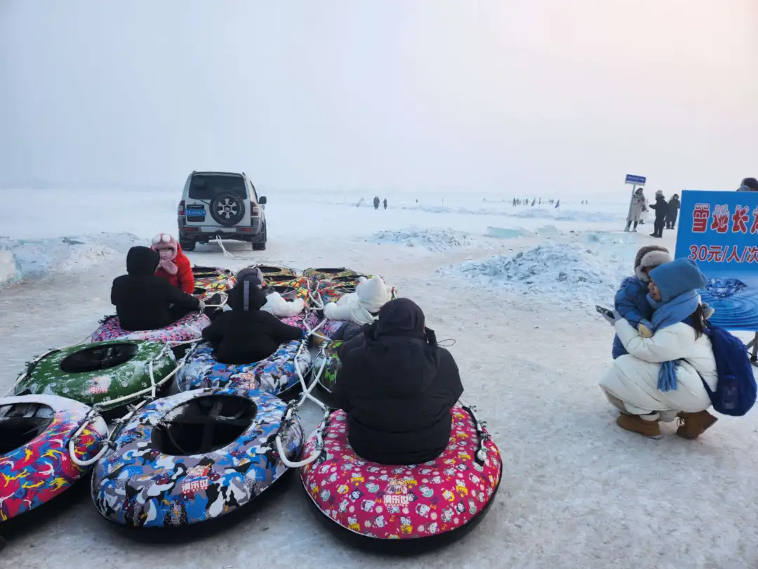 小孩子喜欢去江上滑冰、抽冰陀螺。必须是冻得邦邦硬的江面才行。尔滨爆火后,江面上多了不少新的游乐项目,坐雪圈、狗拉爬犁,热闹极了。