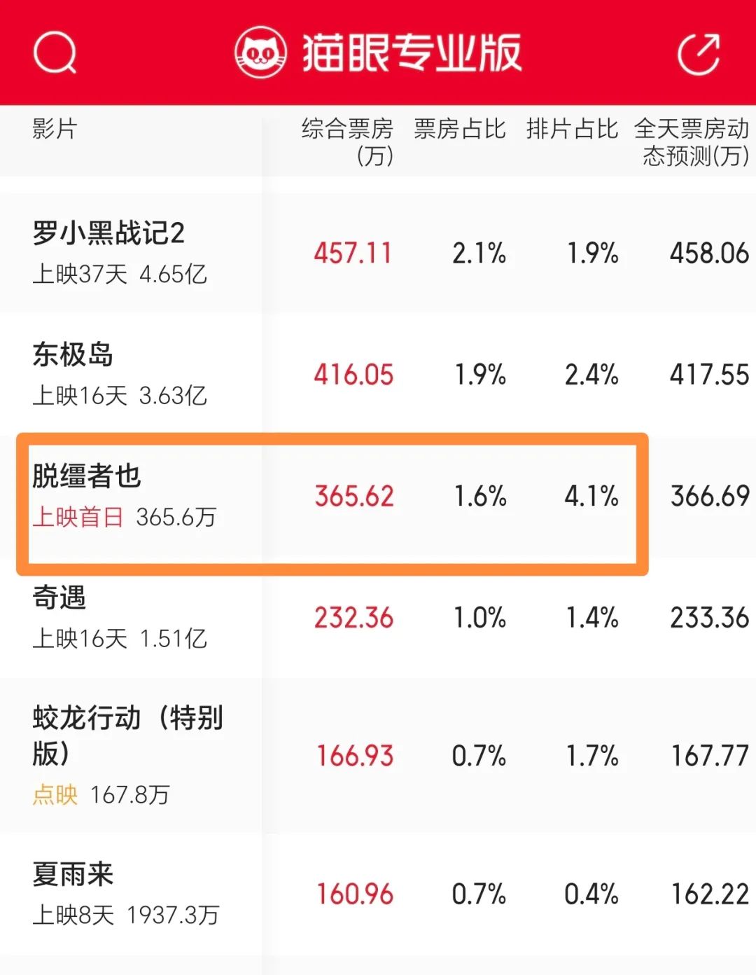 上映首日,《脱缰者也》只拿到了不足5%的排片,收获票房300多万元。猫眼专业版给出的预估总票房不到2000万元,网上关于电影的口碑也两极分化。