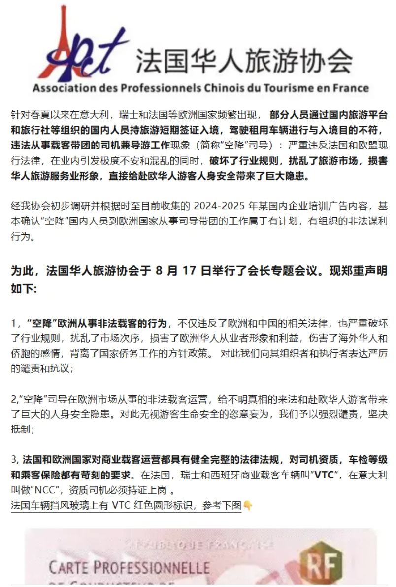 声明中,法国华人旅游协会称部分人员通过国内旅游平台和旅行社组织的国内人员持旅游短期签证入境,驾驶租用车辆进行与入境目的不符,违法从事载客带团的司机兼导游工作现象(简称“空降”司导)。