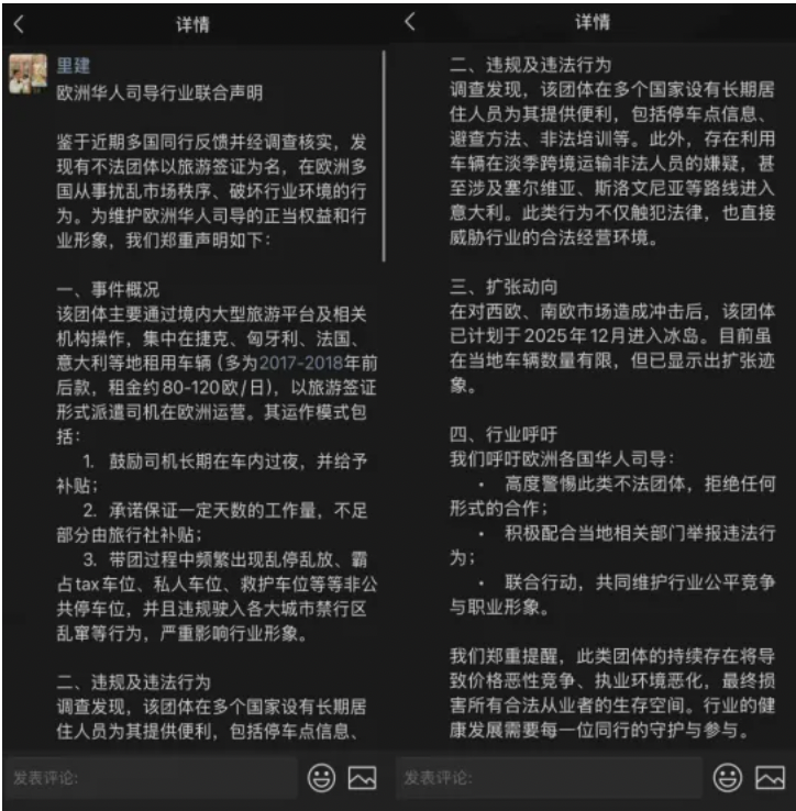 很快,我又在朋友圈看到长居奥地利维也纳的知名华人导游里建也转发了另一份《欧洲华人司导行业联合声明》,进一步揭示了国内空降的黑车司兼导团体操作手法与价格机制。