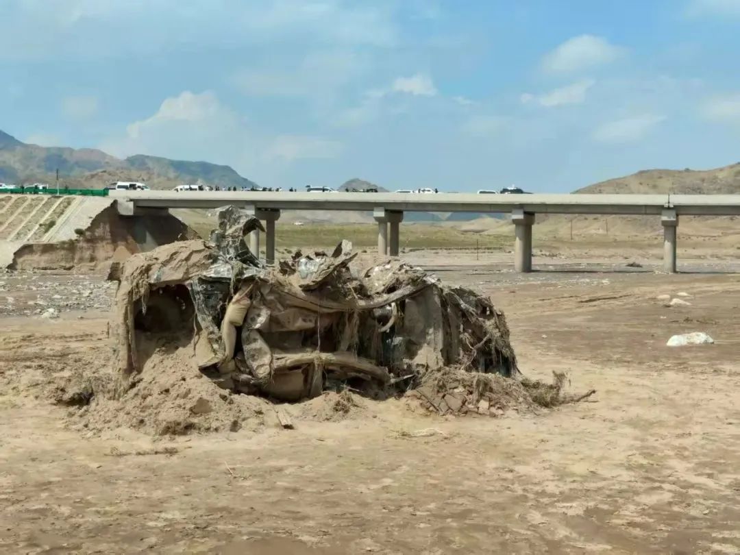 洪灾过后,被冲刷的汽车。@李海峰供图