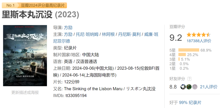 这部由方励斥资数千万、累计耗时近十年、辗转多国拍摄的纪录片,虽然票房不佳,但豆瓣评分高达9.2,它相当详细地描述了“东极岛事件”的起因、经过、结果。从当年中国渔民们的英勇无畏、中国人的无私付出,到日本兵的阴险狡诈、草菅人命,再到英国老兵们的彼时遭遇和今日现状,都淋漓尽致地展现在了观众眼前。