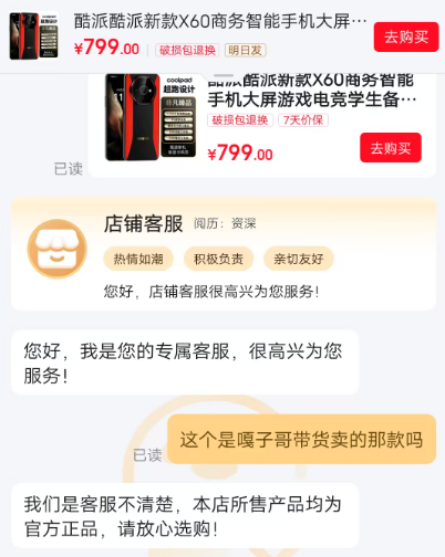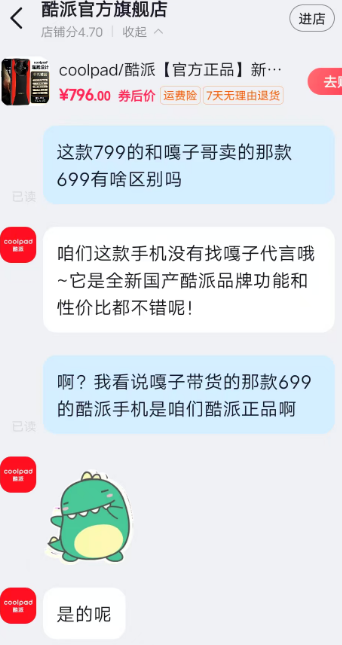 酷派抖音旗舰店客服一开始则表示799这款手机没有找嘎子代言,在凤凰网财经《公司研究院》进一步追问嘎子带货的699那款手机是否是酷派正品时,该客服表示“是的”。