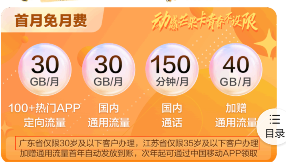 《BUG》栏目在中国移动官网页面看到,该套餐标明广东省仅限30岁及以下客户办理,江苏省仅限35岁及以下客户办理。广东移动和江苏移动两地客服分别证实有年龄限制,但未给出设置该条款的具体原因。