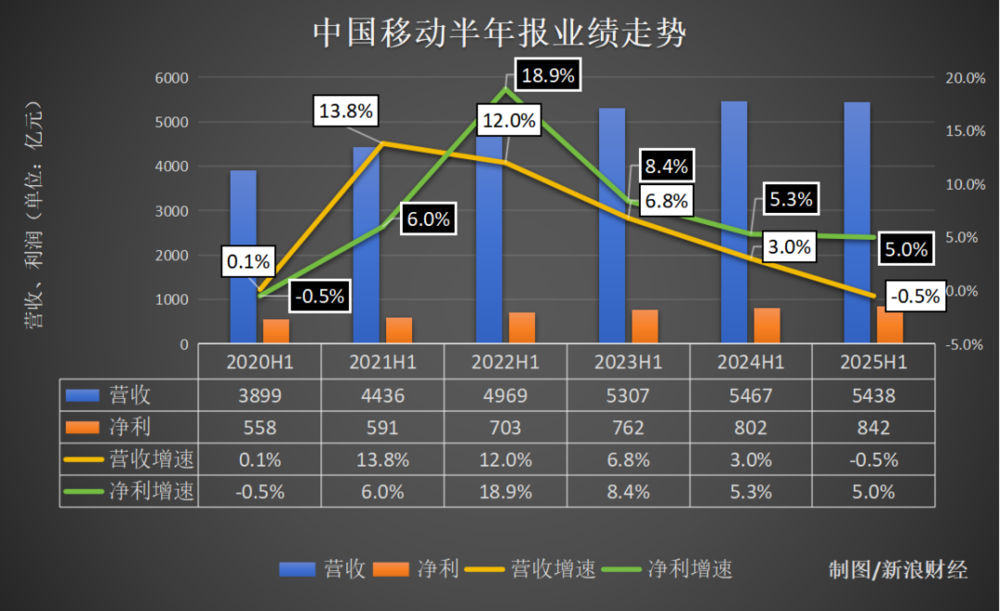 财报显示,中国移动今年上半年实现营收5438亿元,同比下滑0.5%,《BUG》栏目梳理发现,这是其自2020年以来,也即是创下近六年以来,半年报首次出现营收负增长;净利润842亿元,同比增长5.0%,净利增速也创下近五年来新低。