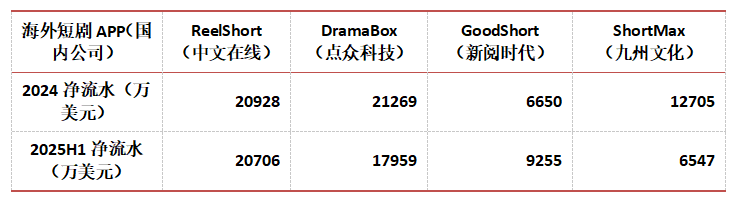 根据Sensor Tower的统计,今年1—6月份,ReelShort的双端(ios和Google play)净流水为2.07亿美元,位居海外短剧类APP首位,相较2024年同期(7498万美元)增长176%。紧随其后的DramaBox尽管增长也相当迅速,但在APP内购的流水上还是稍逊一筹。
