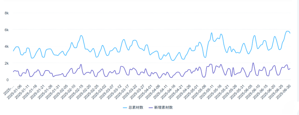 然后,是买量投放的大盘,根据DataEye-ADX专业版数据,2025年上半年海外短剧素材投放量达442.7万组,是2024年上半年52.4万组的8.4倍。