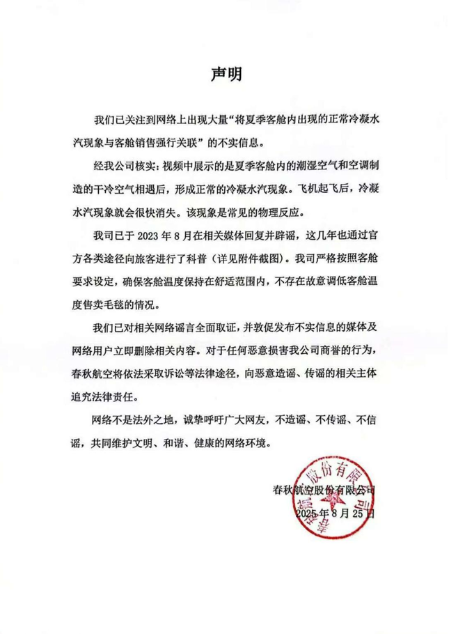 8月25日下午,春秋航空发文回应称:这些是“将夏季客舱内出现的正常冷凝水汽现象与客舱销售强行关联”的不实信息,视频中展示的是夏季客舱内的潮湿空气和空调制造的干冷空气相遇后,形成正常的冷凝水汽现象。飞机起飞后,冷凝水汽现象就会很快消失。该现象是常见的物理反应。不存在故意调低客舱温度售卖毛毯的情况。
