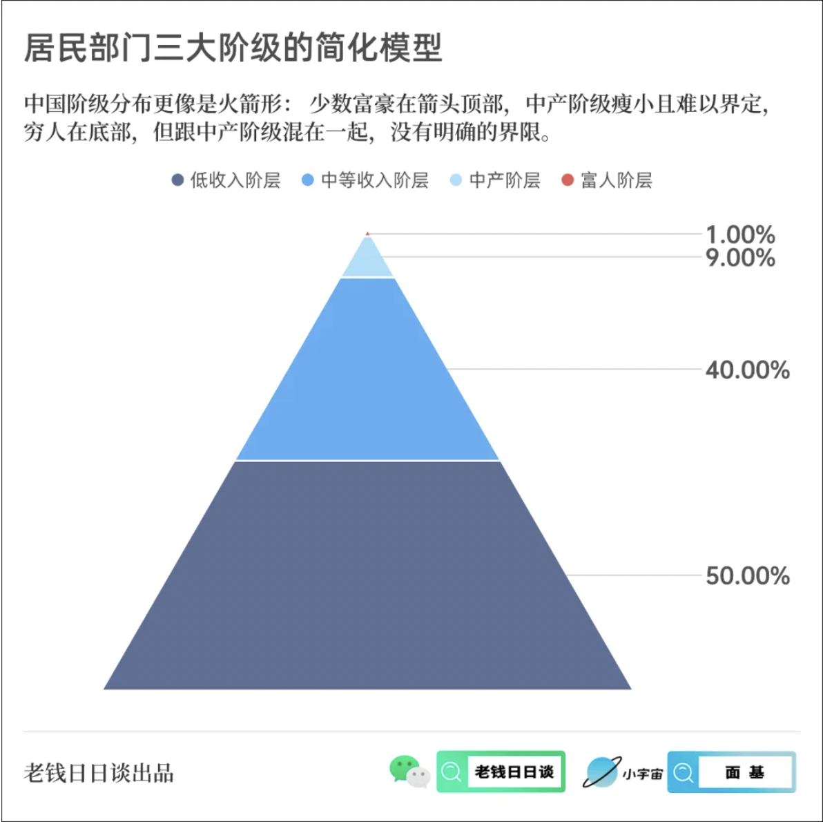 那说到中产,就不得不提一下我个人最爱使用的一个理解居民部门的框架,就是1-9-40-50这个简化模型,老听友们应该耳朵都快听出茧子来了,就是1%的富人、9%的中产、40%的中等收入群体以及50%的低收入群体。
