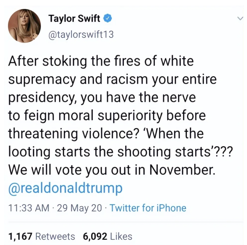 2020年5月29日,泰勒·斯威夫特在推特上公开批评特朗普。(图/社交媒体截图)