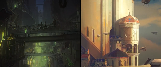 这背后其实是制作团队邀请了专业的建筑大师Joon Ahn来设计场景,融合了法国建筑风格、新艺术流派以及蒸汽朋克的风格设计,使双城在建筑场景上的质感形成鲜明的对比。所以,在剧集呈现时,皮尔特沃夫的场景充满了工业气息,而底城祖安则恰好相反,建筑风格多是木质的场景,到处是混乱的气息。